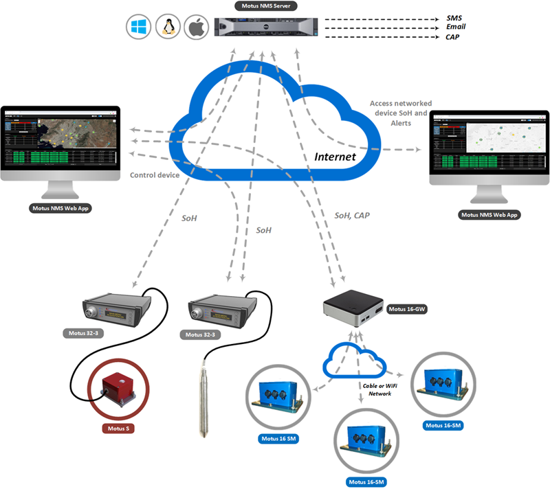 MOTUS NMS is the Network Management System of ASTRIAL digitizers and accelerographs. Developed with state of the art Web technologies, MOTUS NMS is able to work with static and dynamic IP device addresses by either scanning the local network or using instrument pre-configured settings.